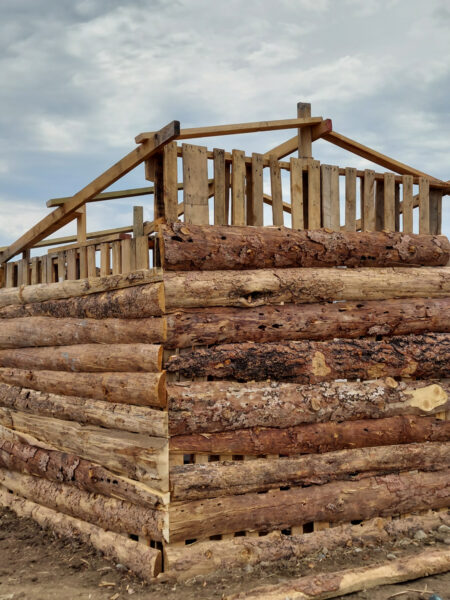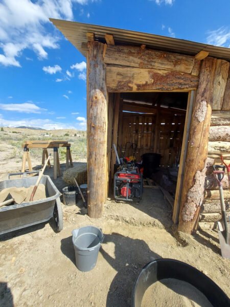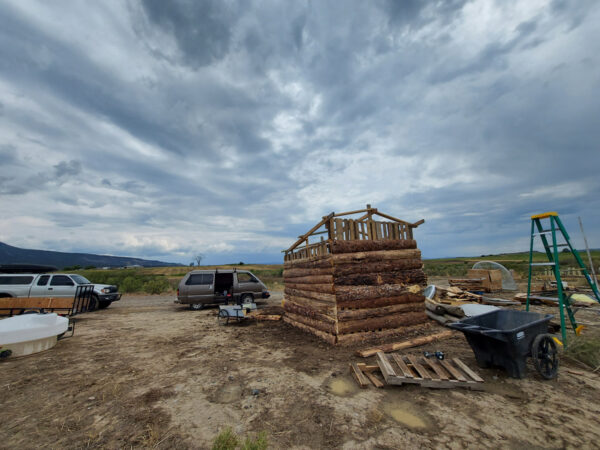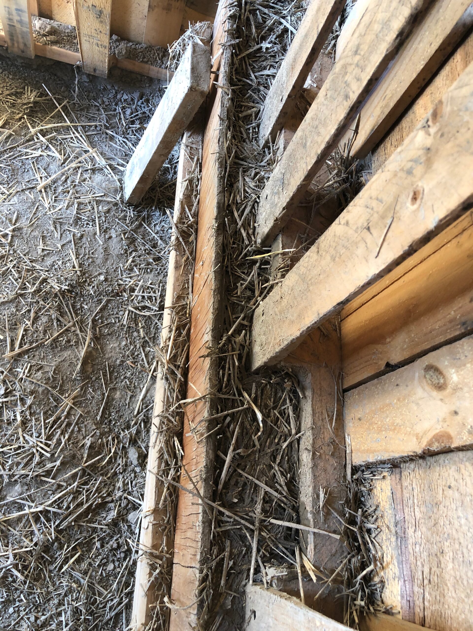 A hybrid structure of the truest sense, its skeleton is made of reclaimed pallets insulated with light straw clay, clad with raw edge lumber from the local mill, and even a Skycrete slab floor. By far the most expensive part of this shed was the roof and the screws. Eventually the interior will be completed with natural plasters and the outside gaps will be filled with a Skycrete mortar. The shed’s usage will evolve over the first few years as our building projects demand.